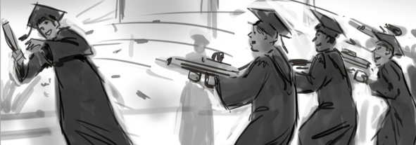 Frames are often done a bit smaller in scale. Compositions are blocked in very quickly with the emphasis on the drawing, broader values, and the staging of the story. The detail is implied but not labored over.